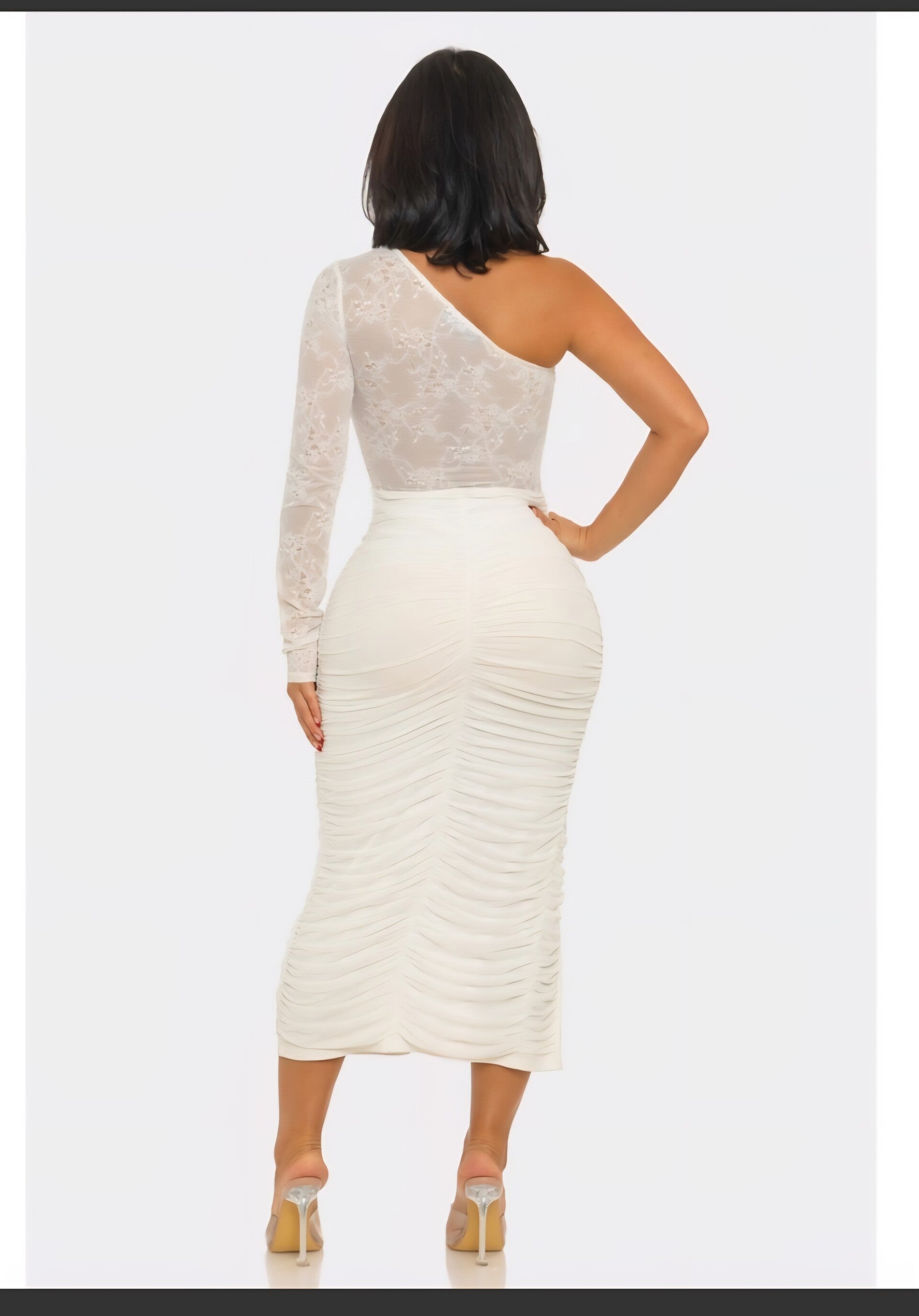 Sophisticated and sexy, this one-shoulder ruched dress with lace accents creates a sleek silhouette that turns heads wherever you go.