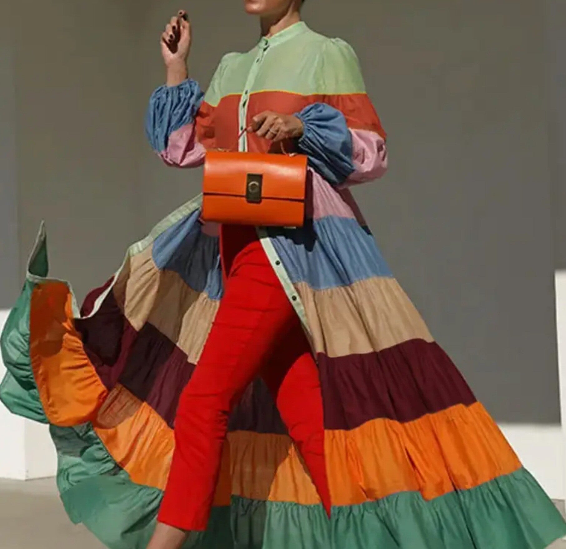 A vibrant coat featuring a bold contrast striped collar that adds a pop of color and personality to any outfit.